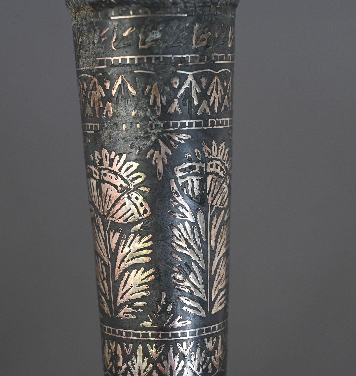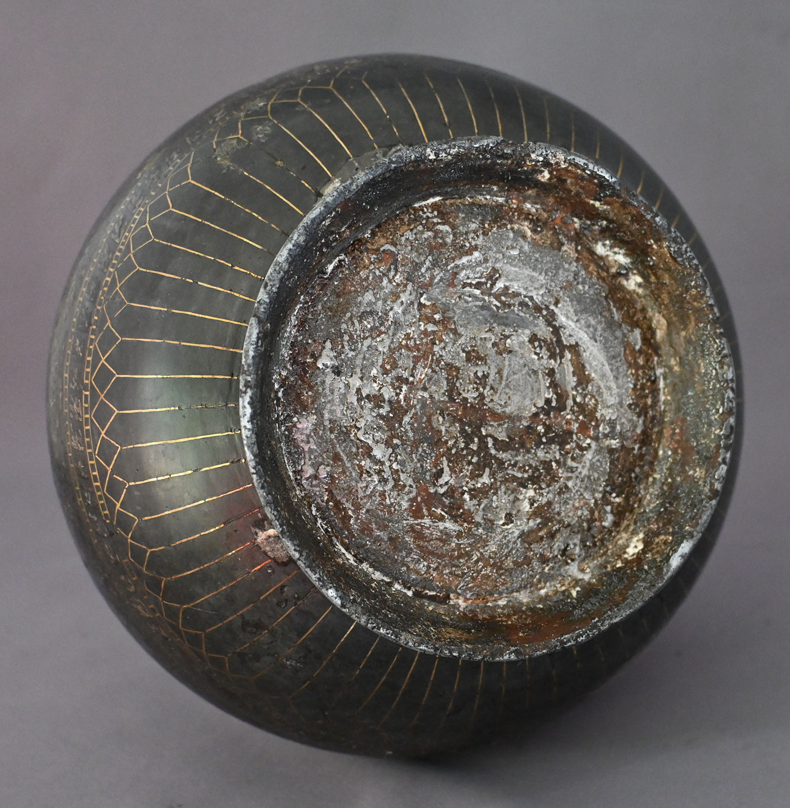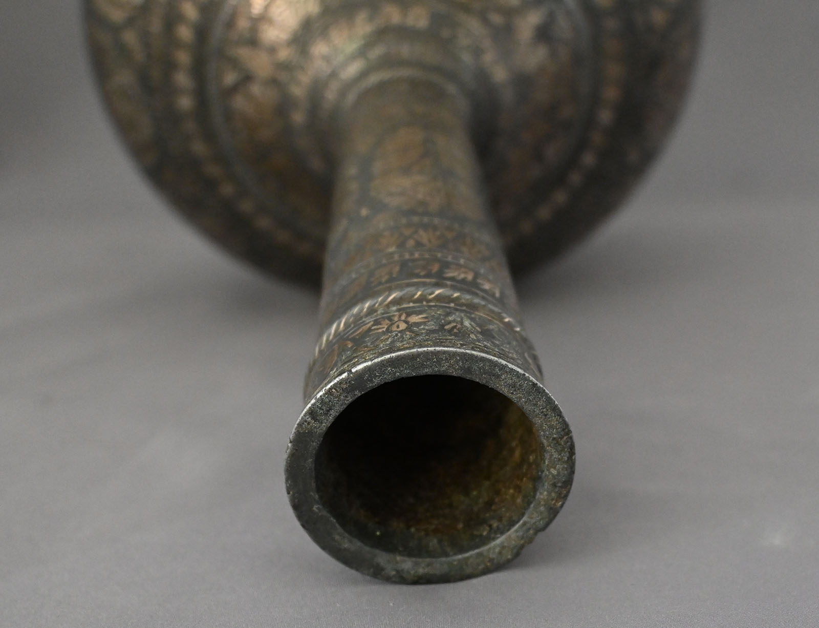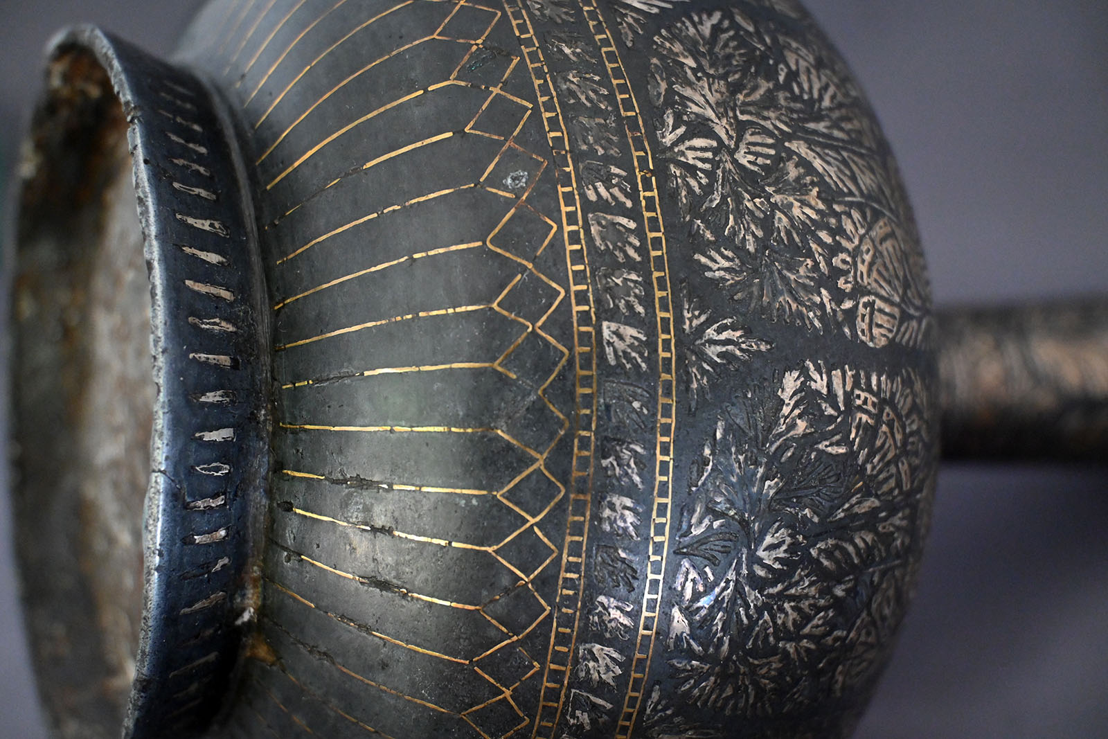 19th Century Bidri Ware water bottle a metal craft from Bidar Karnataka India. It is tediously intricately moulded, filed, designed, engraved, silver inlay, smoothing, buffing, oxidizing, blackened by old black soil or ammonium chloride. It is decorated with an ancient floral design, there is also geometric gold or brass inlay on the bottom. It is made in two pieces. It dates from 1850 or earlier. It could have had a lid. It measures 10 ½ inches tall x 6 ¼ inches wide. The silver contrast against the black is beautiful. It is called a Surahi Water Bottle. It weighs over 1400 grams.