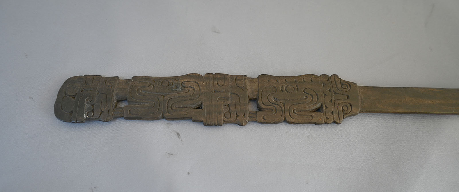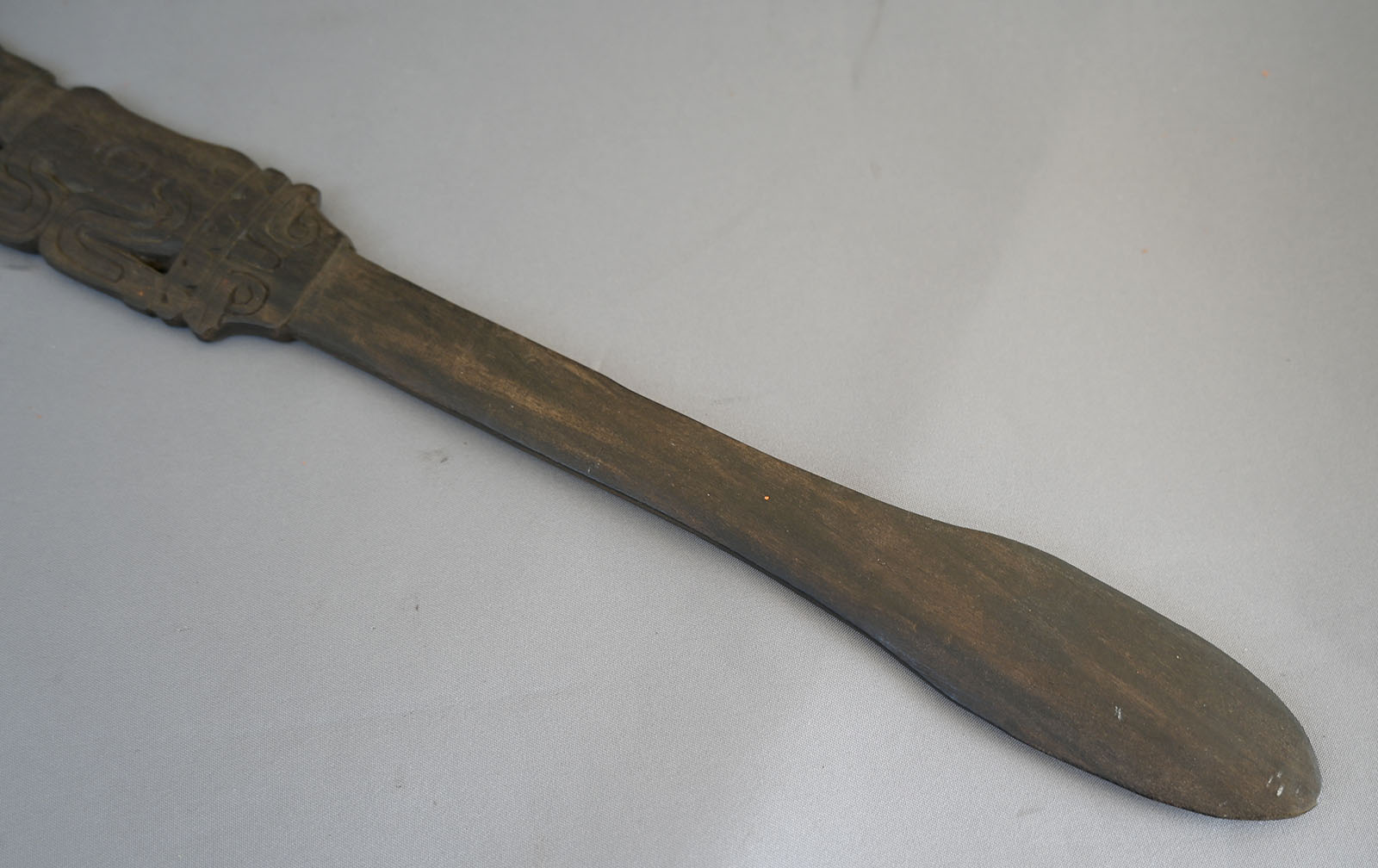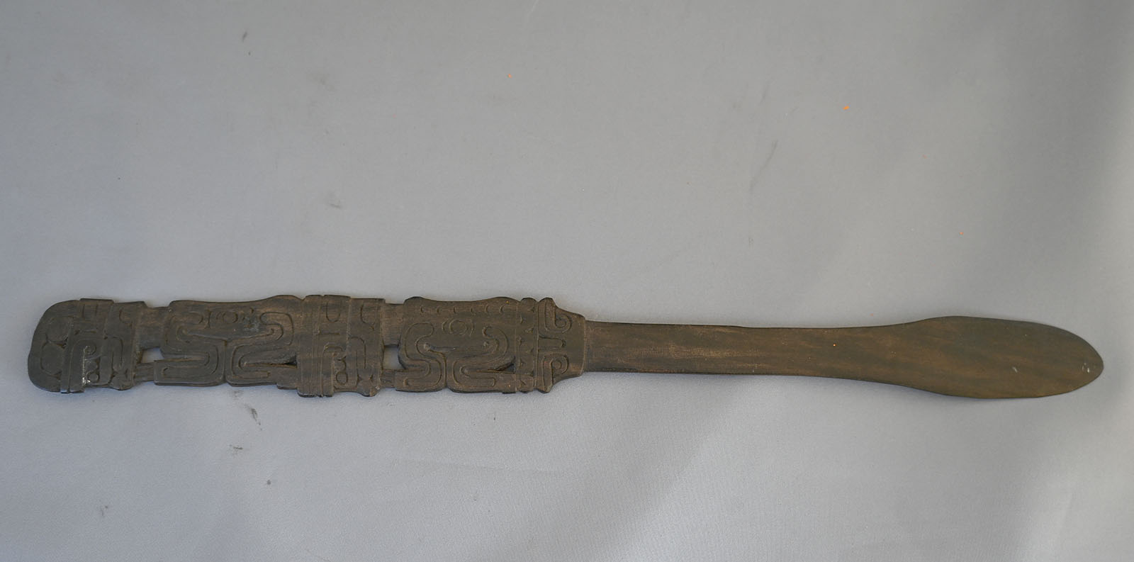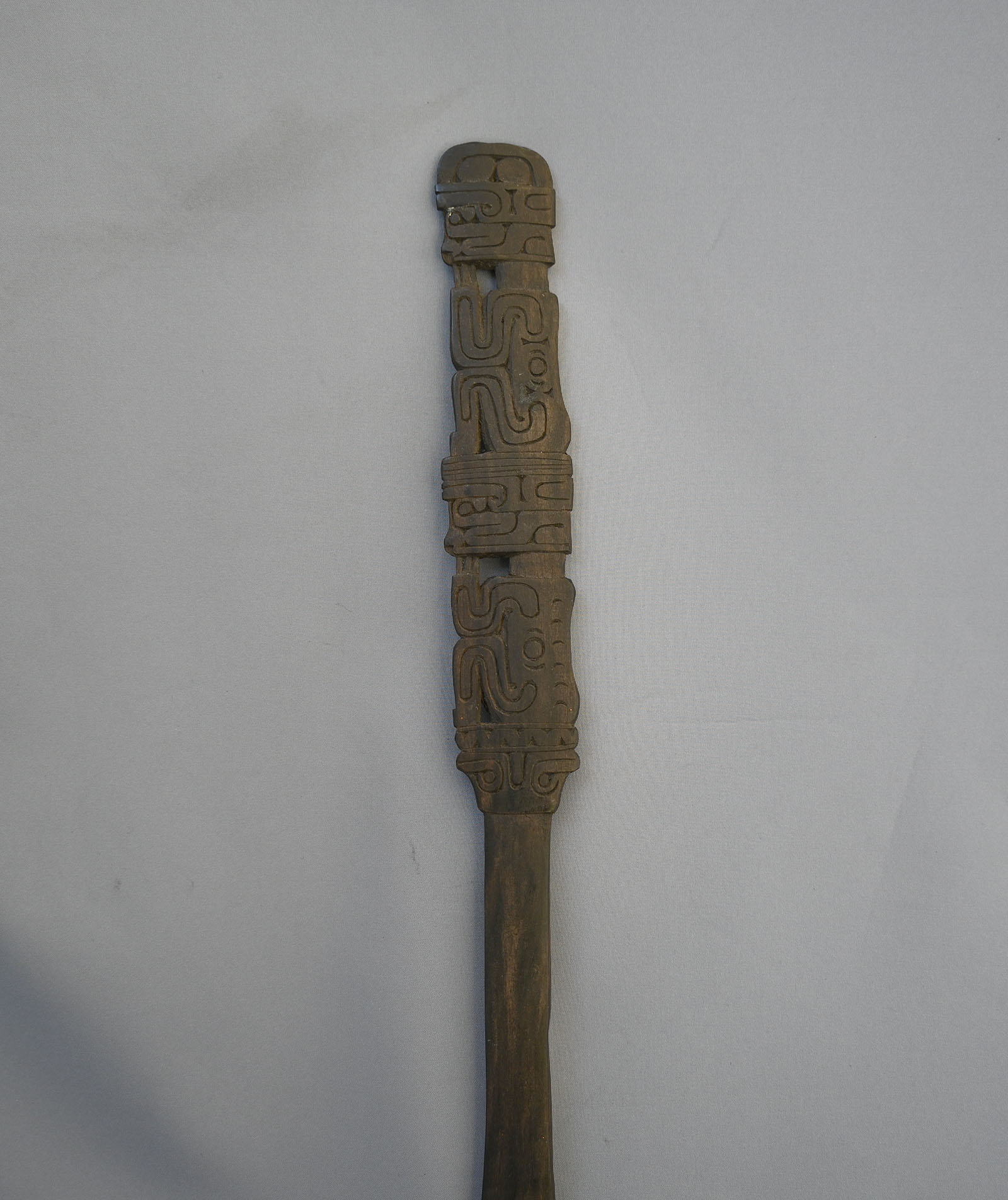 Finely carved figural wooden spatula. From Papua New Guinea collected in the early 1970’s. It is made for the use and preparation of betel nut. It measures 14 inches long x 1 and 1/4 inches wide. Good condition.