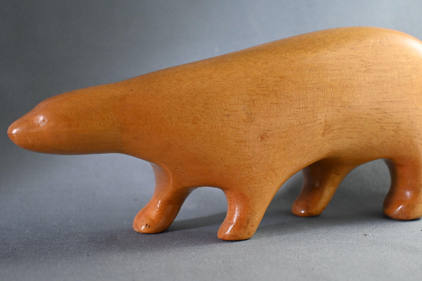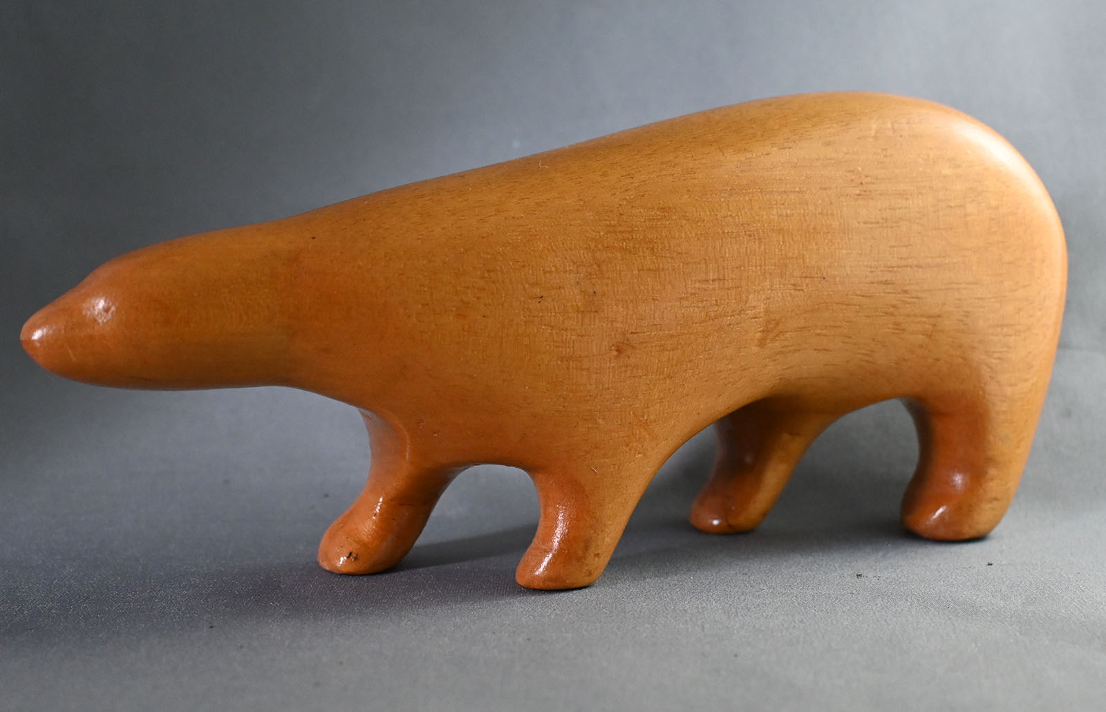 This piece is unsigned, it is hand carved from a found piece of wood. It is very hard to get wood up north and is found on the beach. It depicts a walking polar bear, a majestic animal. It has been varnished, I date between 1950 – 60, when varnish was popular to use. It has a restoration on the forward back lag, it is under the varnish, I believe it was done when it was made. It is most likely from the Nunavut, Canada. It is an unusual piece. It measures 9 inches long.